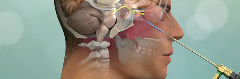 Transsphenoidal literally means “through the sphenoid sinus.” It is a surgery performed through the nose and sphenoid sinus to remove pituitary tumors. Transsphenoidal surgery can be performed with an endoscope, microscope, or both. It is often a team effort between neurosurgeons and ear, nose, and throat (ENT) surgeons.
